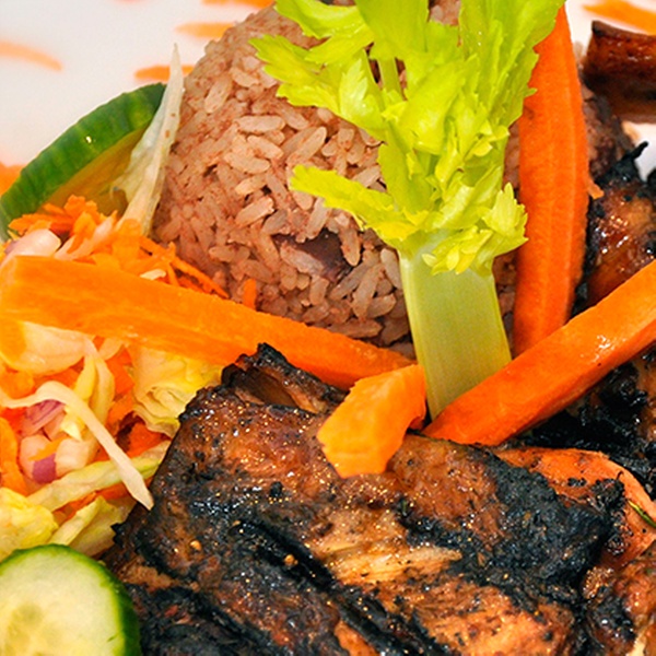 Authentic Caribbean cuisine with chicken, goat, beef and vegetable is served in an exotic décor