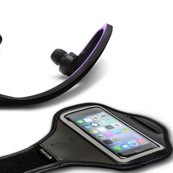 Armband with see-through window holds your smartphone or MP3 player while the sweat-proof in-ear headphones wirelessly stream music from it